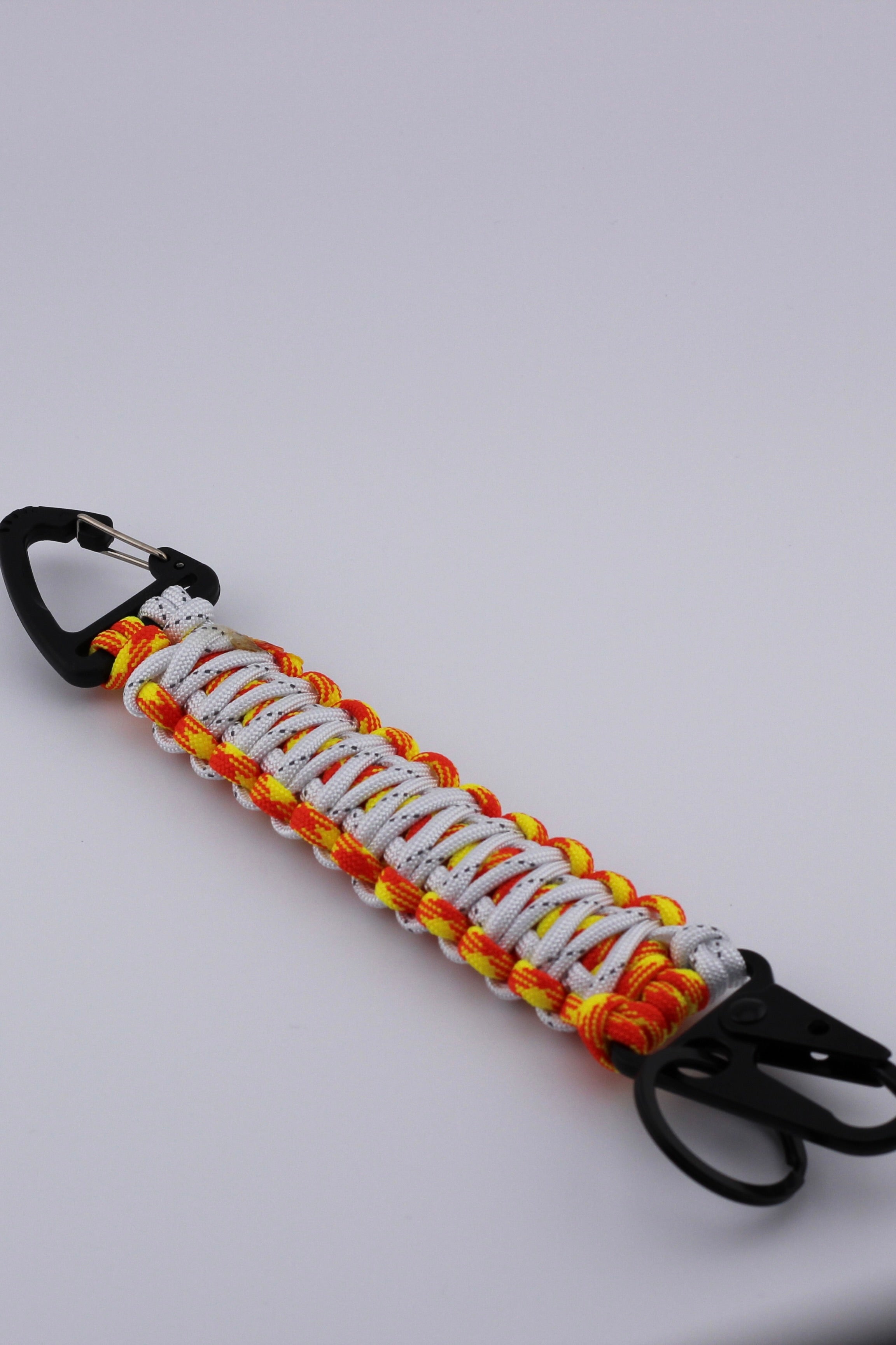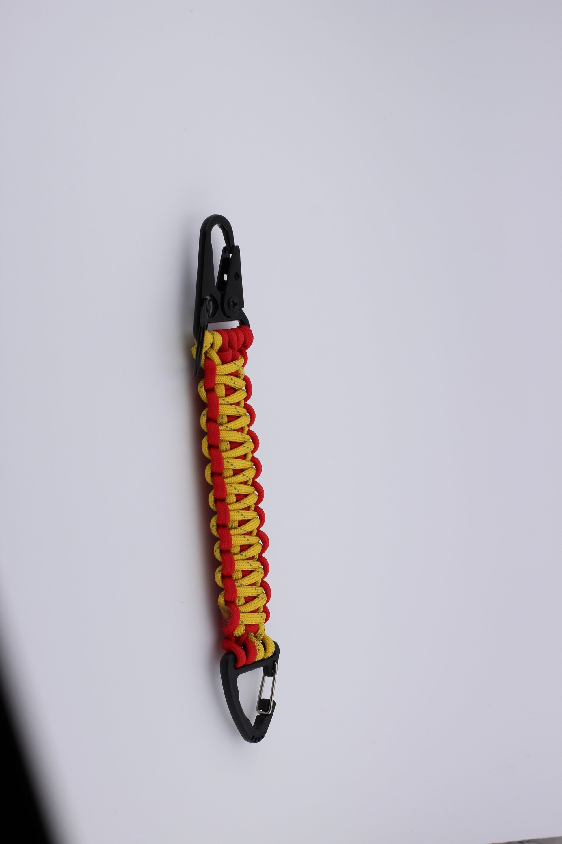 This is a standard King Cobra (double Cobra) weave keychain, measures 6in in length and totals 12ft of paracord.  Also features a heavy duty HK style carabiner and on the other end a 2in triangle carabiner.  Can be made in 1 or 2 colors in various sizes.  Pick your favorite sports team or school colors, or show off your creativity with your own color combinations.